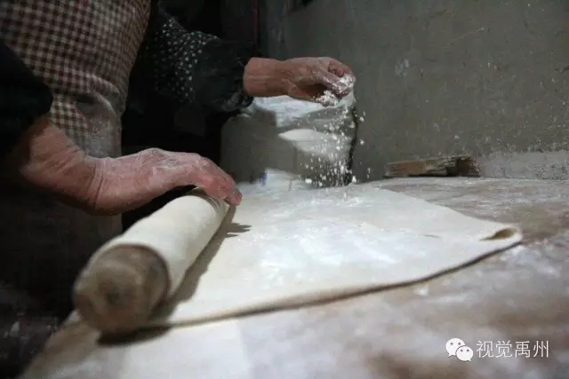用手摸摸看面皮厚度是否均匀,如果有较厚的部分,需用擀面杖将面皮擀成一致的厚度。