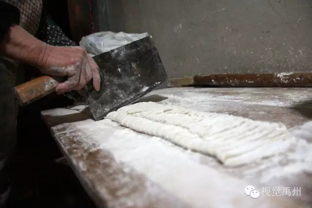 面皮擀好之后,再用完全干燥的利刀,采用直切法缓慢而均匀地切下,宽细随意。如果面皮擀得较薄,切成宽面会更好。
