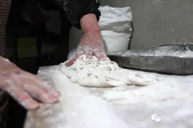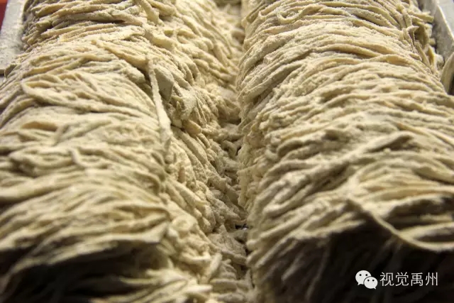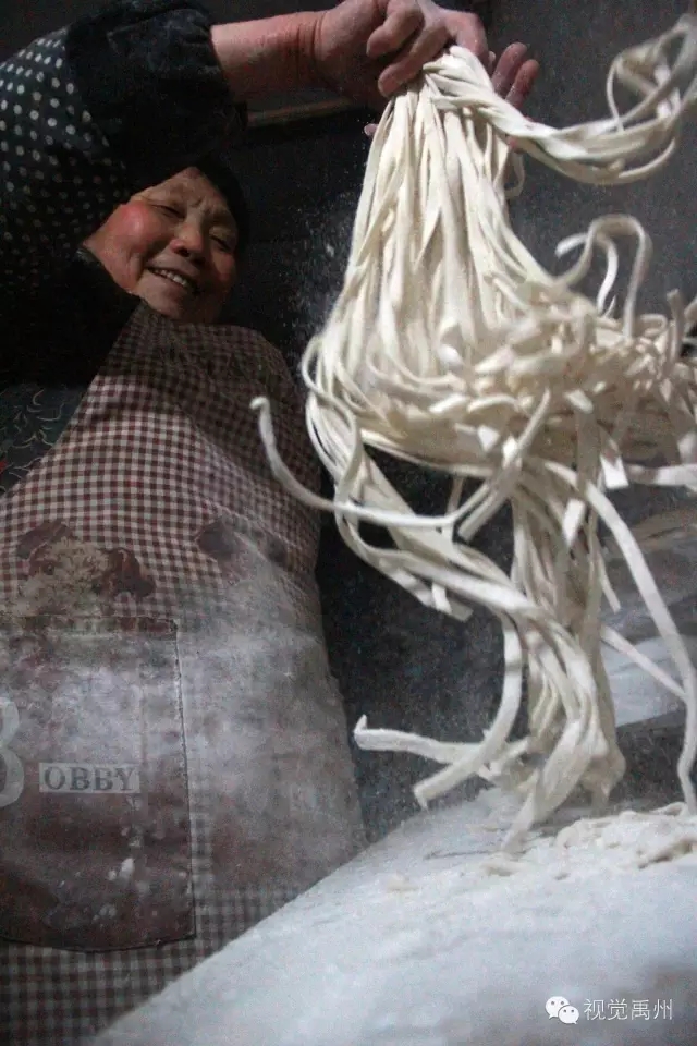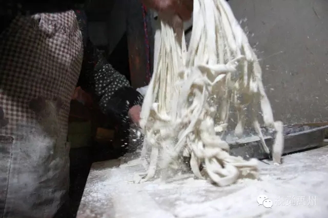 往切好的面条上撒些较多的薄面,然后轻轻地搅动面条,直到根根分明互相不粘连,把面条提起抖掉多余的薄面。老人抖面的动作潇洒自如,让人看着分明是一种美的享受。