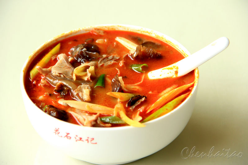 当你慕名来到花石几家不起眼的羊肉汤店,一进门就能闻见扑鼻的肉香。 进到店里,你会看到师傅熟练的挥舞手中的刀,片出一碗碗羊肉。花石羊肉汤店无一例外的都有一口直径约一米的大锅架在炉灶上,锅内的汤中放满了羊肉和羊骨头。鲜香的汤汁在大锅里翻腾,雪白的羊骨在锅底静静释放出诱人的美味。锅上方吊着黑亮的铁钩,几块漂亮的肉正挂在上面。炉膛内火光熊熊,锅内奶白色的汤在“咕嘟咕嘟”地翻滚,随着热气、烟气升腾、弥漫,羊肉的香气肆意飘洒。一盆红通通的辣椒油成为提升汤味和勾人食欲的主角,这辣椒油可有讲究,一定要切下羊肉上的羊油,放在锅内炼制,捞出油渣,再放入研碎的红辣椒末,炸至香味溢出即可。