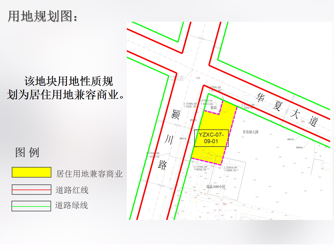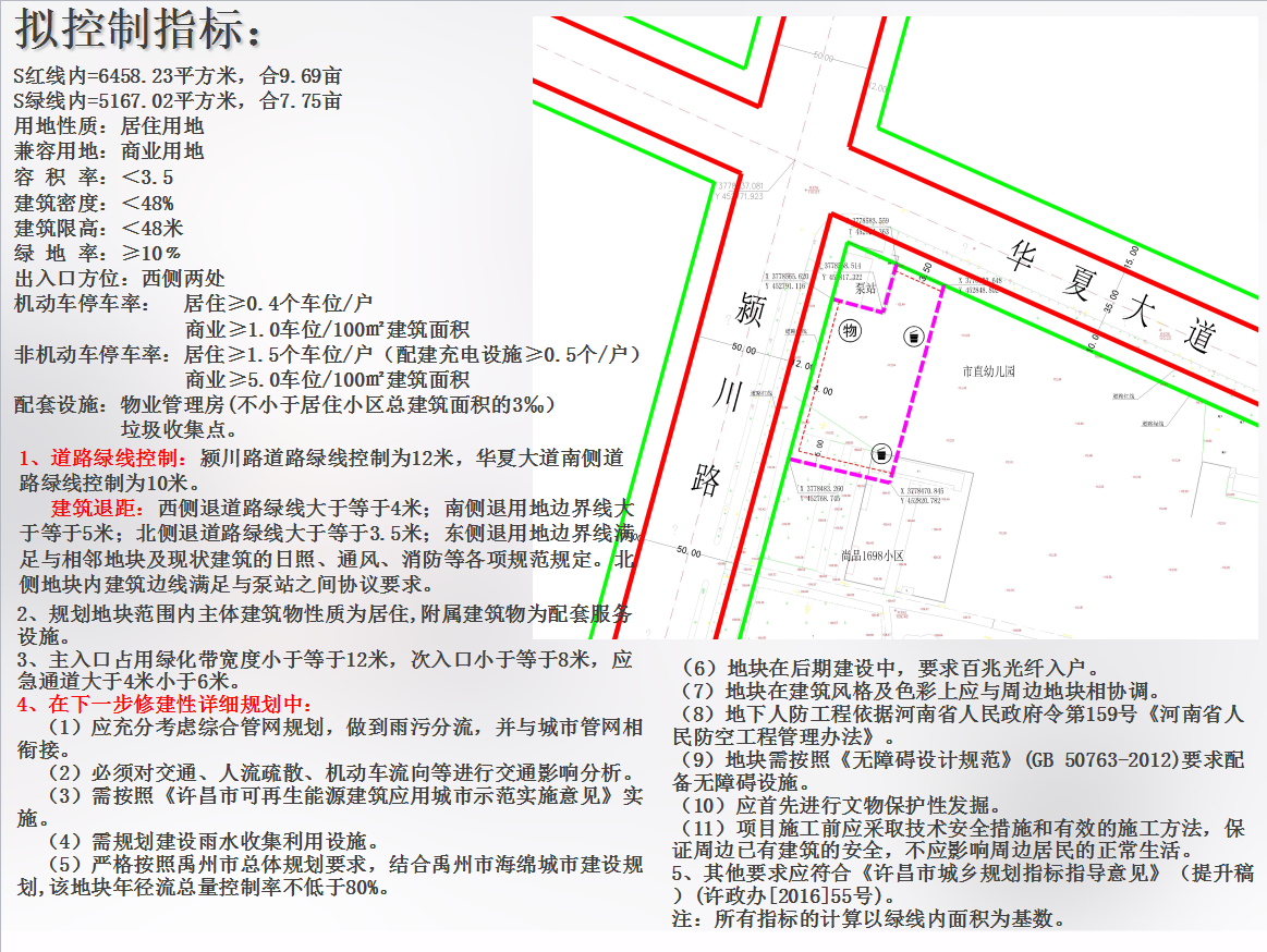 1、道路绿线控制:颍川路道路绿线控制为12米,华夏大道南侧道路绿线控制为10米。
