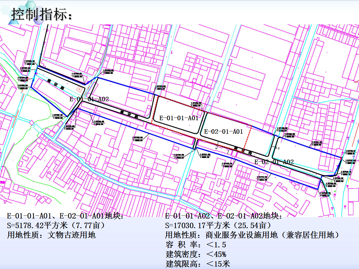 S=17030.17平方米(25.54亩),用地性质:商业服务业设施用地(兼容居住用地),容积率<1.5,建筑密度<45%, 建筑限高<15米。